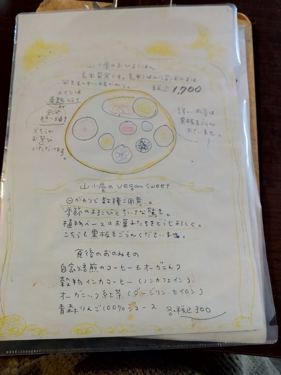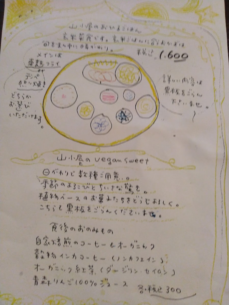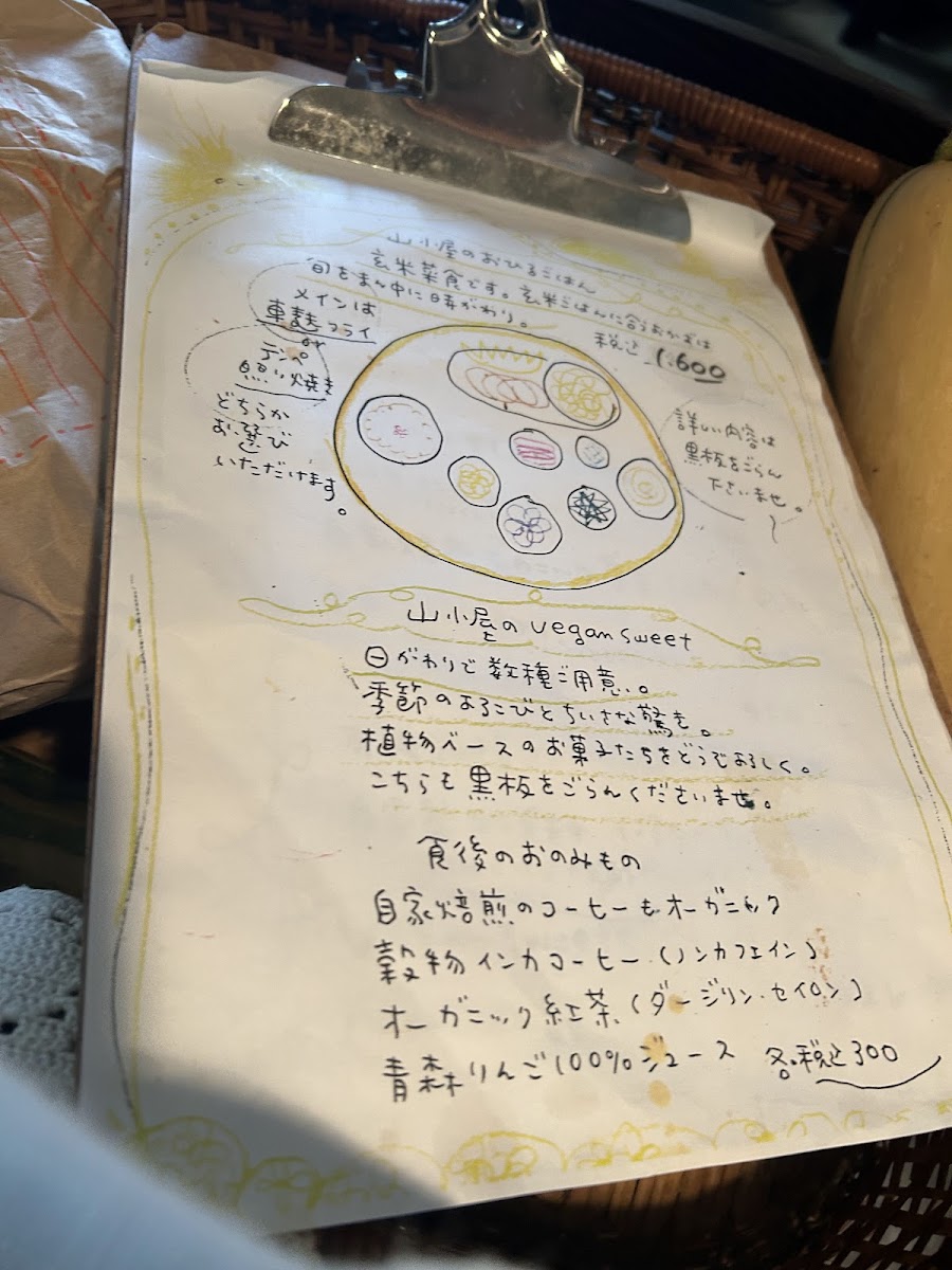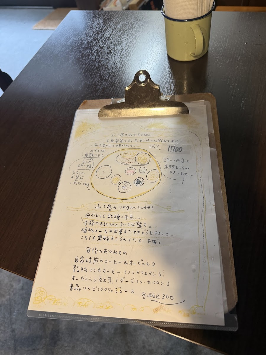 Yamagoya’s menu offers a simple yet thoughtfully crafted selection that reflects its cozy café atmosphere. Focused on wholesome, comforting meals, the menu centers around a daily changing lunch plate that brings together a variety of seasonal, plant-based dishes made with care. This includes options like 自家焙煎のcoffee to accompany the meal, alongside homey favorites such as くるみとリンゴのクランブルケーキ and 生麩フライのランチ, which provide satisfying flavors without complexity.