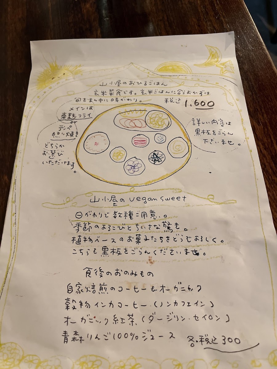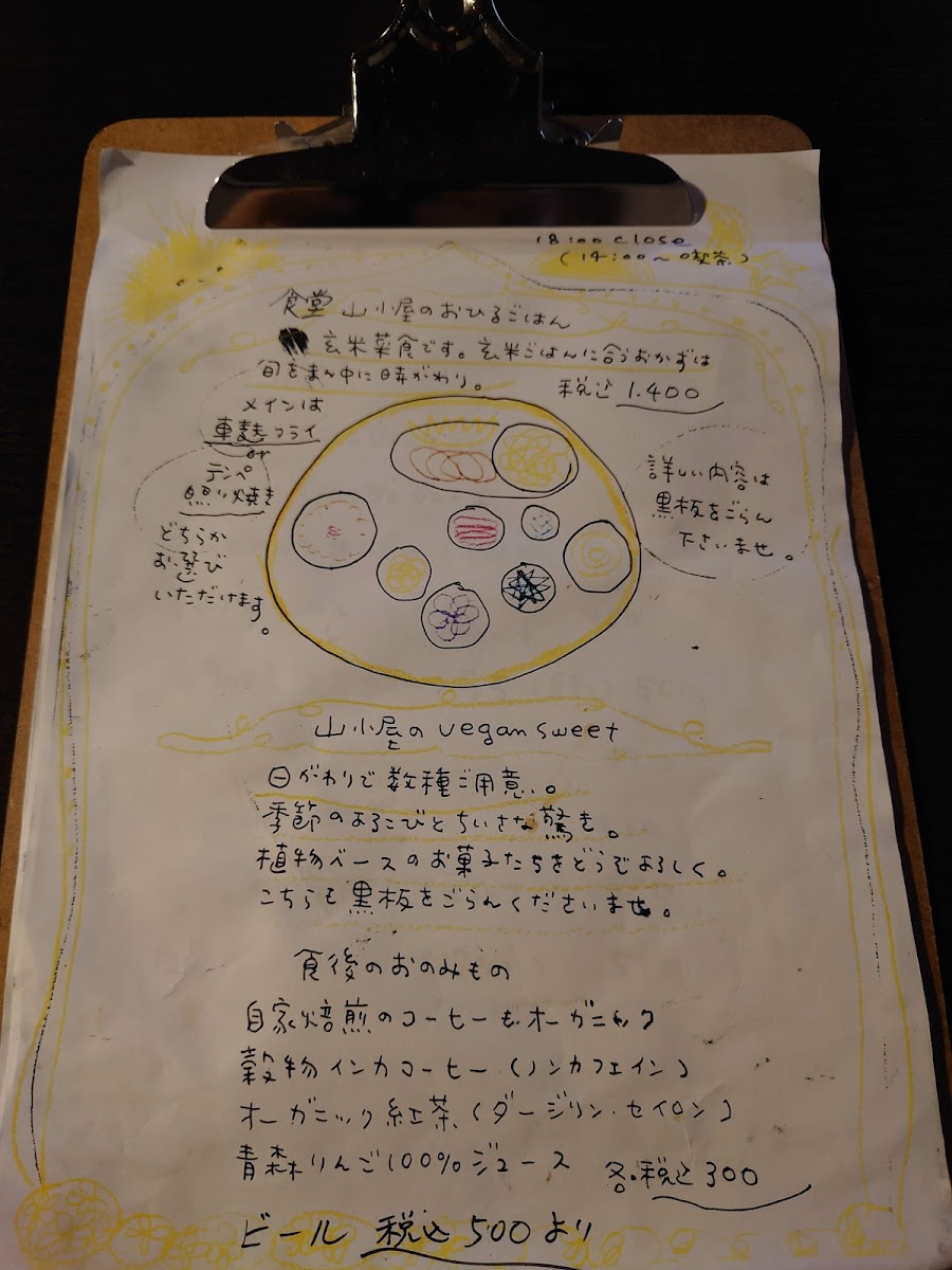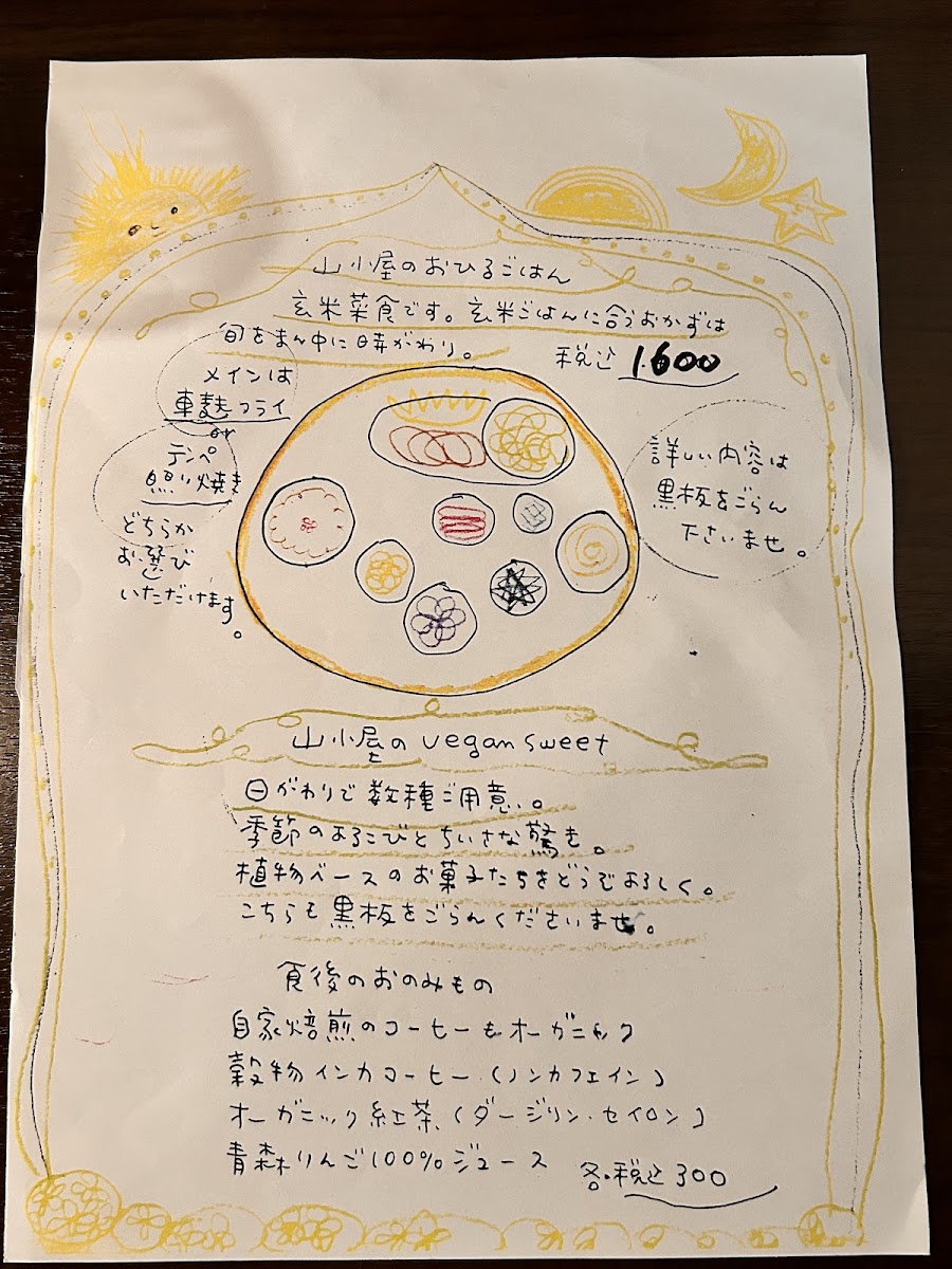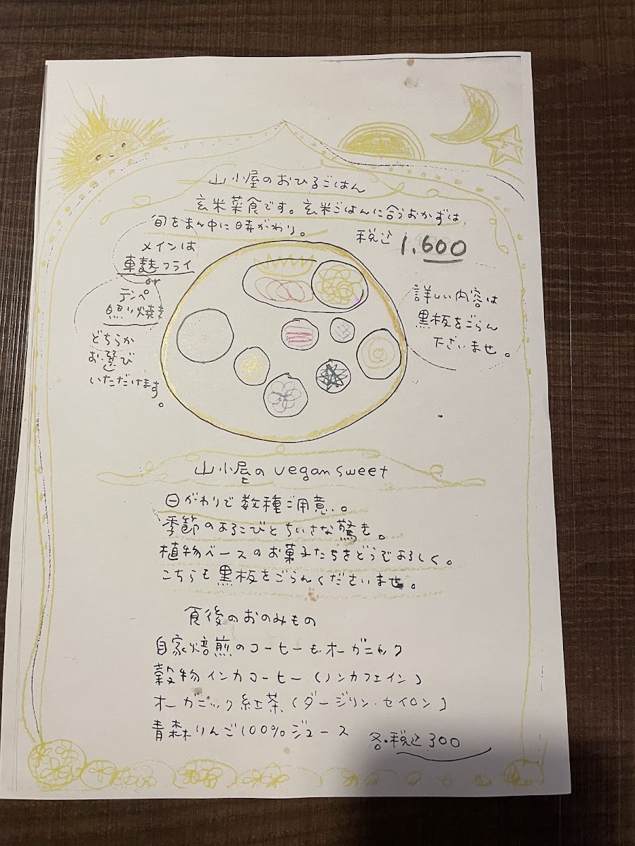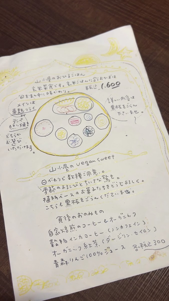 Yamagoya’s menu offers a simple yet thoughtfully crafted selection that reflects its cozy café atmosphere. Focused on wholesome, comforting meals, the menu centers around a daily changing lunch plate that brings together a variety of seasonal, plant-based dishes made with care. This includes options like 自家焙煎のcoffee to accompany the meal, alongside homey favorites such as くるみとリンゴのクランブルケーキ and 生麩フライのランチ, which provide satisfying flavors without complexity.
